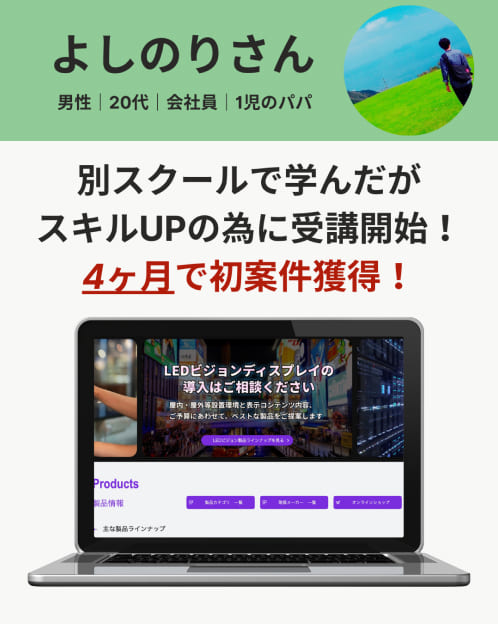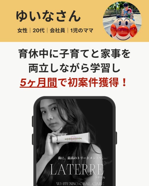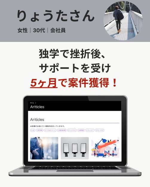 副業からフリーランスになりたいと思って入会しました。優しく向上心が高い方が多いので、初心者の私でも挫折せずに進められましたし、今までの自分からは考えれない全く別の職種が広がり、考え方や人生観も変わりました。